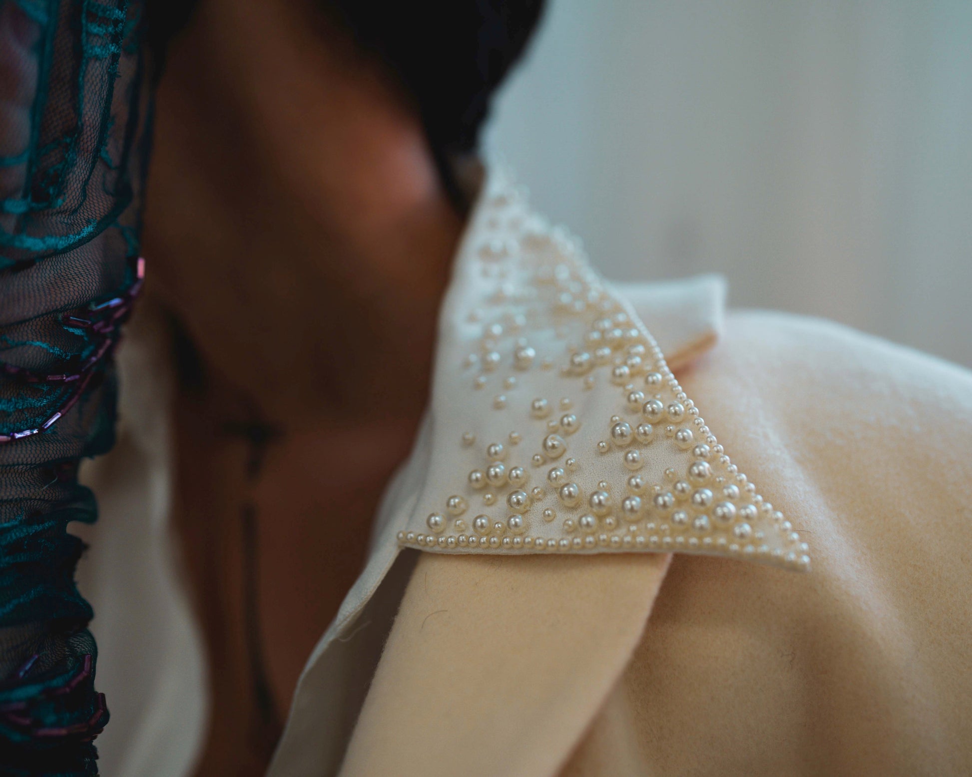 DESCRIPTION: Pearl Encrusted Collar and Cuffs, comes with removable shoulder pads