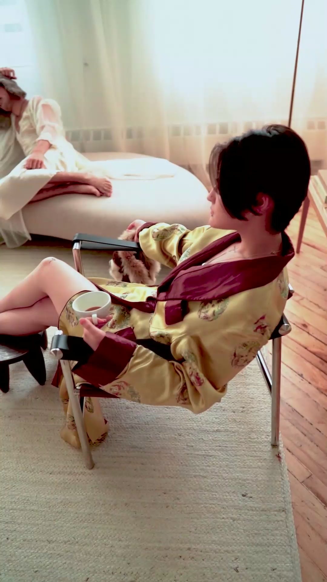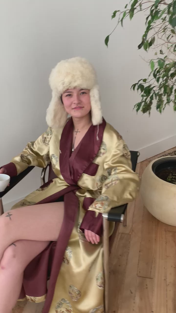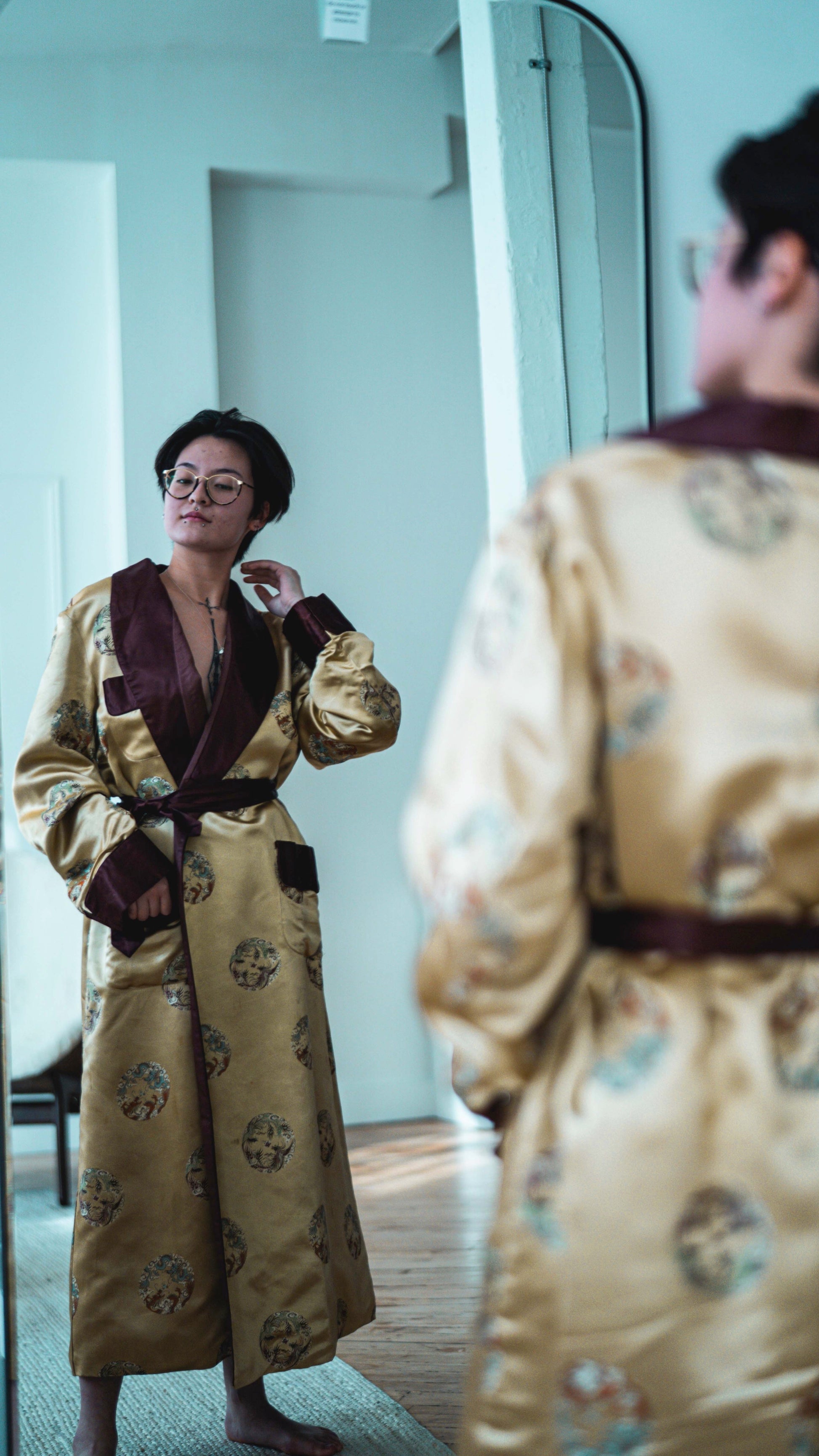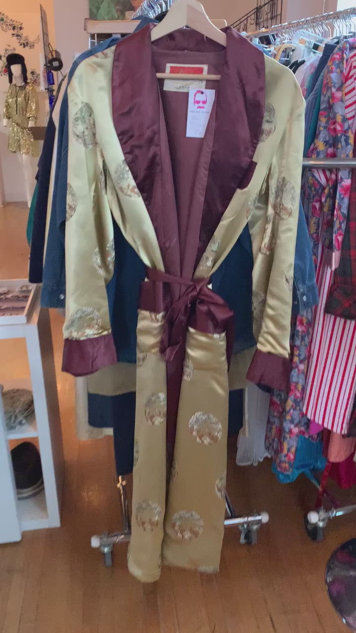 DESCRIPTION: 1990s Shimmery gold and burgundy Heavy silk Robe